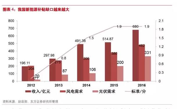 2016年預(yù)計(jì)征收額可達(dá)到1100億元,但實(shí)際征收額不足700億元。隨著風(fēng)電及光伏發(fā)電行業(yè)上網(wǎng)電量不斷擴(kuò)大,補(bǔ)貼基金面臨巨大的資金缺口。2016年全年可再生能源電價(jià)補(bǔ)貼缺口超過100億元,累計(jì)缺口超過600億元。