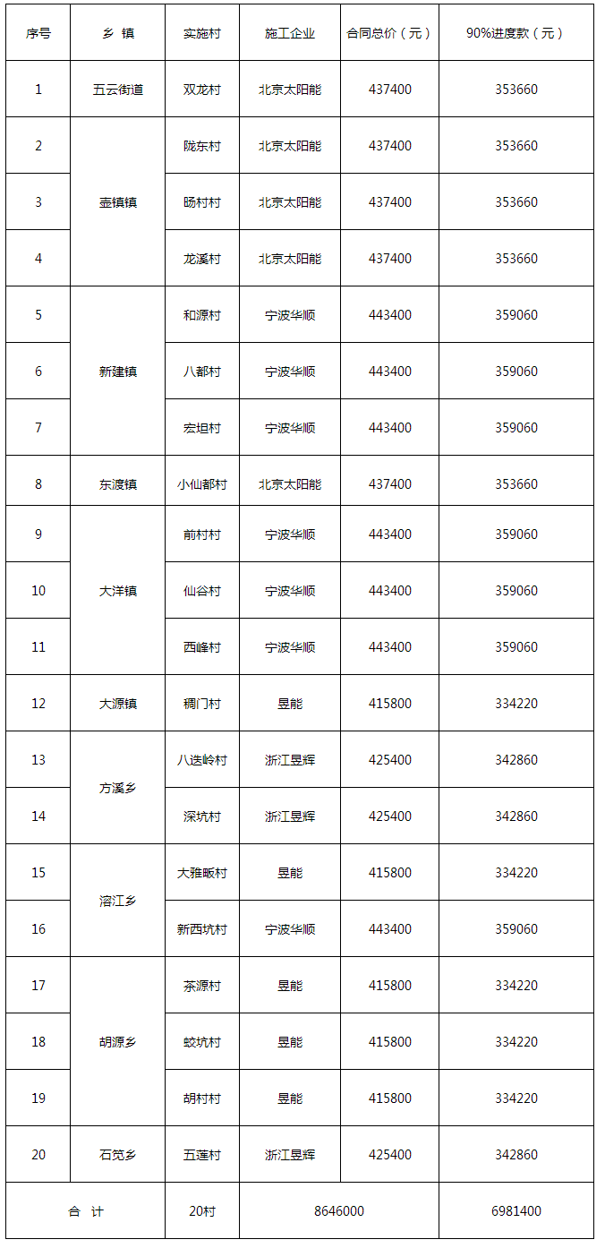 根據(jù)《關(guān)于下達光伏助村實施項目的通知》(縉農(nóng)〔2017〕5號)精神,以及各鄉(xiāng)鎮(zhèn)與中標施工作業(yè)單位簽訂的合同條款約定,目前止20個村項目主體工程已全部完成,現(xiàn)將擬撥付五云街道雙龍村等20個光伏助村項目進度款進