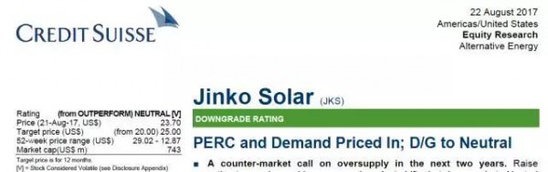 2017年8月22日,CreditSuisse(以下簡稱CS)也降低了晶科能源的評級。