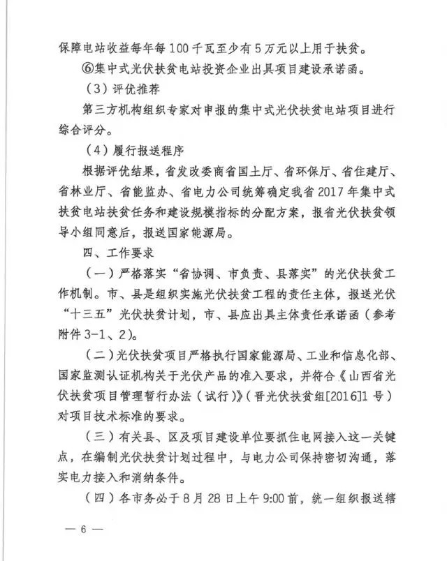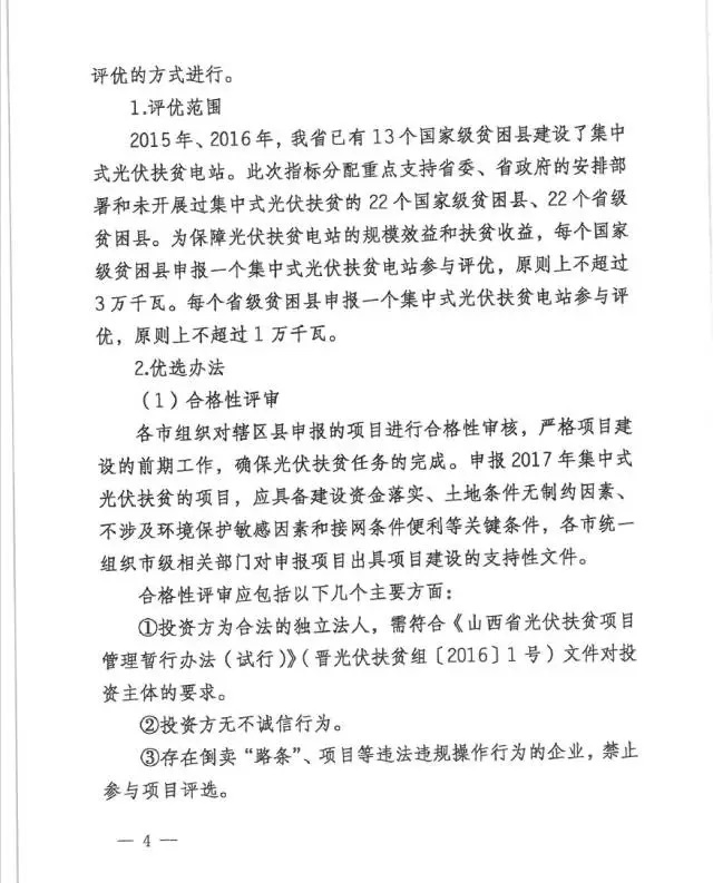 近日,山西發(fā)改委、山西扶貧辦聯(lián)合下發(fā)《關(guān)于開展我省”十三五“光伏扶貧計劃編制工作的通知》。根據(jù)通知,“十三五”光伏扶貧的主要建設模式為村級電站(包括多村聯(lián)建)和集中式電站兩種。單個村級電站容量控制在300萬千瓦左右,電網(wǎng)公司出具證明具備就近接入條件的,可放大至500萬千瓦。而集中式電站,能源局下達山西的2017年800MW光伏指標全部用于集中式扶貧電站,規(guī)模分配在各市縣申報初審的基礎上,委托第三方機構(gòu)采用競爭評優(yōu)的方法進行。
