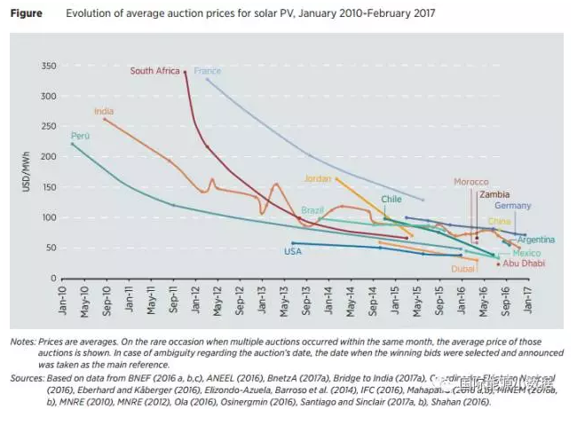 根據(jù)國(guó)際可再生能源署最新發(fā)布的《可再生能源競(jìng)價(jià)分析報(bào)告》,到2016年中已經(jīng)至少有67個(gè)國(guó)家以競(jìng)價(jià)方式確定可再生能源項(xiàng)目,而2010年時(shí)只有10個(gè)國(guó)家實(shí)行可再生能源項(xiàng)目競(jìng)價(jià)。相比固定的標(biāo)桿價(jià)格,可再生能源競(jìng)價(jià)有效地降低了可再生能源上網(wǎng)的價(jià)格。2010年,風(fēng)電合同平均價(jià)格為80美元/兆瓦時(shí)、光伏為250美元/兆瓦時(shí);而2016年風(fēng)電平均合同價(jià)下降37.5%,為40美元/兆瓦時(shí),光伏下降幅度更達(dá)到80%,為50美元/兆瓦時(shí)(相當(dāng)于人民幣0.33元/千瓦時(shí))。