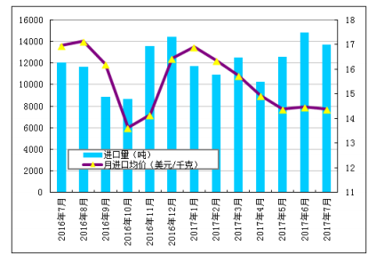 圖3 2016年7月-2017年7月多晶硅進口量及進口均價示意圖