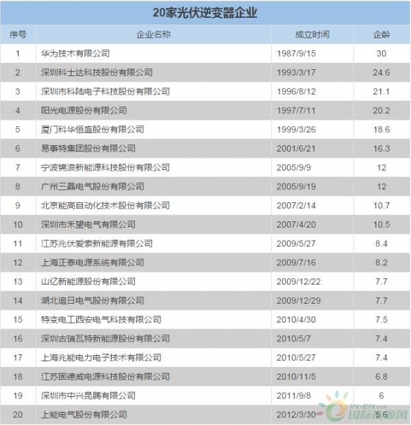 注:部分企業(yè)的光伏業(yè)務(wù)是該公司的相對新業(yè)務(wù),但考慮到總公司的實力、資信水平是光伏業(yè)務(wù)的后盾,所以統(tǒng)計時以總公司的成立時間為準(zhǔn)。如,華為雖然成立于1987年,但2012年才進入逆變器業(yè)務(wù);但毫無疑問,華為的整體實力為其逆變器業(yè)務(wù)提供了強大的后援支持,也為其后期服務(wù)保障。