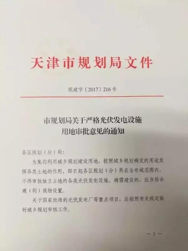 近日,天津市規(guī)劃局發(fā)布《市規(guī)劃局關(guān)于嚴(yán)格光伏發(fā)電設(shè)施用地審批意見的通知》。通知稱,為集約利用城鄉(xiāng)規(guī)劃建設(shè)用地,按照城鄉(xiāng)規(guī)劃確定的用途發(fā)揮各類土地的作用,即日起全市不得審批獨(dú)立占地的各類光伏發(fā)電設(shè)施。確需建設(shè)的,應(yīng)結(jié)合建(構(gòu))筑物設(shè)置。文件原文如下: