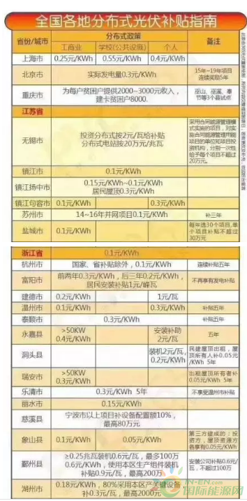 隨著分布式光伏發(fā)電的大力推廣,在屋頂安裝光伏已然成為一種潮流。當(dāng)然,安裝光伏是一筆不小的投資,為此,國家對光伏進(jìn)行了補(bǔ)貼。以下圖片便是全國各地光伏補(bǔ)貼的具體情況。