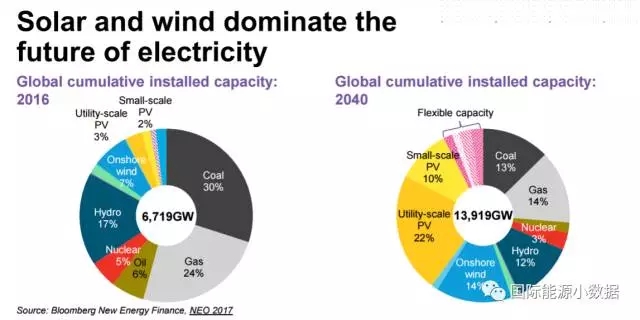 根據(jù)BNEF的數(shù)據(jù),2016年全球電力裝機6719吉瓦,其中煤電占比30%,其次是天然氣發(fā)電(24%)、水電(17%)、陸上風電(7%)、燃油(6%)、光伏(5%)、核電(5%)。可見,2016年化石能源發(fā)電容量占比達到60% BNEF預(yù)測2040年全球