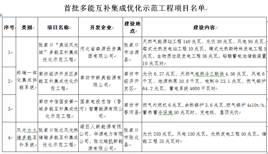 張家口、廊坊市發(fā)展改革委,國(guó)網(wǎng)冀北電力有限公司:按照國(guó)家能源局《關(guān)于公布首批多能互補(bǔ)集成優(yōu)化示范工程的通知》(國(guó)能規(guī)劃〔2017〕37號(hào))和《關(guān)于河北省多能互補(bǔ)集成優(yōu)化示范工程建設(shè)有關(guān)事項(xiàng)的復(fù)函》(國(guó)能
