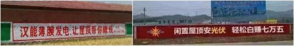 當(dāng)年太陽(yáng)能熱水器躥紅農(nóng)村市場(chǎng),打響”農(nóng)村包圍城市“的市場(chǎng)壯舉,其相關(guān)企業(yè)大范圍、密集刷墻的影響力不容小覷!再來(lái)看看光伏企業(yè)目前刷了多少?gòu)V告:
