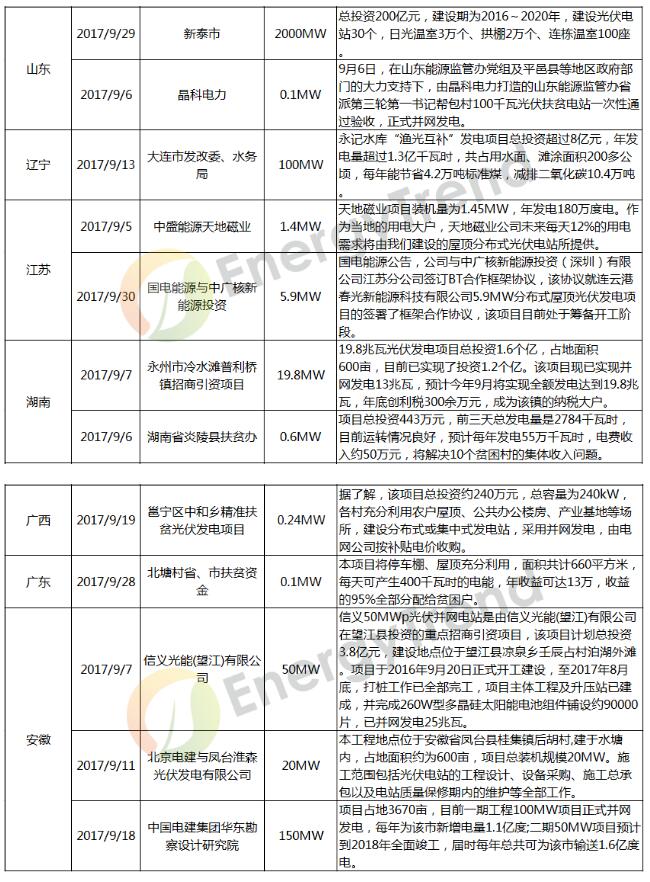 如火如荼的八月已經(jīng)過(guò)去,今年630浪潮的余浪也逐漸平息。7月底,國(guó)家能源局印發(fā)《關(guān)于可再生能源發(fā)展“十三五”規(guī)劃實(shí)施的指導(dǎo)意見(jiàn)》,給出了各省2017-2020年的規(guī)模指標(biāo),至各省區(qū)后,8月底,各省根據(jù)國(guó)家分配的指標(biāo)進(jìn)行了二次分配,9月初,各省的指標(biāo)分配陸續(xù)出臺(tái),將直接影響各省后續(xù)的光伏發(fā)電項(xiàng)目。9月是平息調(diào)整的一月,月前項(xiàng)目持續(xù)跟進(jìn)落實(shí)與后續(xù)項(xiàng)目的規(guī)劃是九月的主要工作,并搜集整理了今年9月全國(guó)各省并網(wǎng)的光伏項(xiàng)目,以供參詳。(若有缺漏,歡迎聯(lián)系指正。)