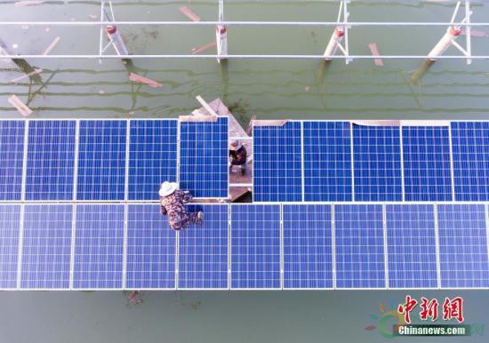 資料圖:航拍正在建設(shè)的江西都昌縣磯山湖“漁光一體”光伏電站。 傅建斌 攝