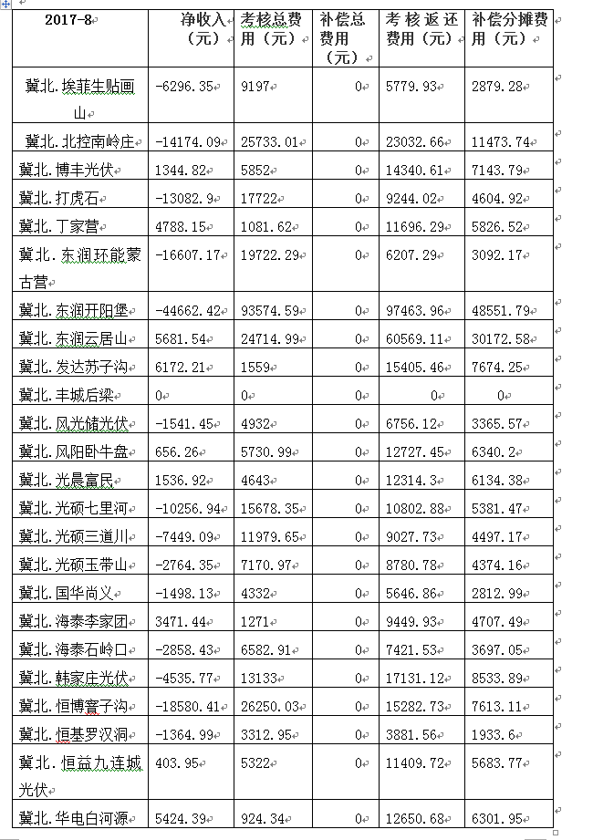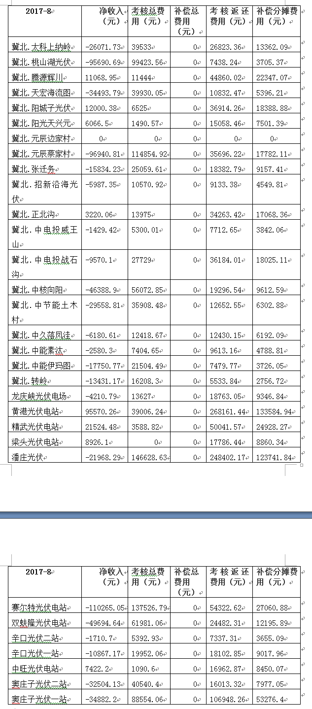 2017年8月京津唐光伏電站并網(wǎng)運(yùn)行結(jié)算匯總表