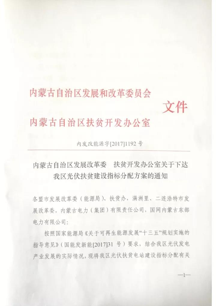 蒙古自治區(qū)發(fā)展改革委扶貧開發(fā)辦公室關(guān)于下達(dá)我區(qū)光伏扶貧建設(shè)指標(biāo)分配方案的通知內(nèi)發(fā)改能源字〔2017〕1192號各盟市發(fā)展改革委(能源局)、扶貧辦,滿洲里、二連浩特市發(fā)展改革委,內(nèi)蒙古電力(集團(tuán))有限責(zé)任公司,