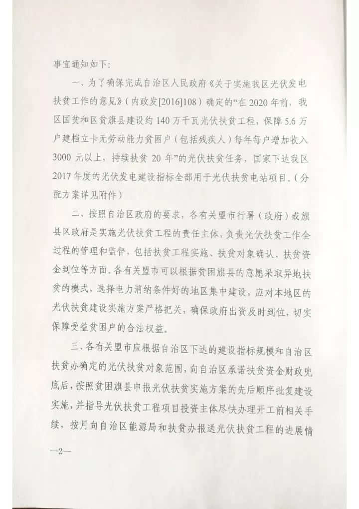 內(nèi)蒙古1GW光伏扶貧指標(biāo)分配方案(2017年全部指標(biāo)用于扶貧)