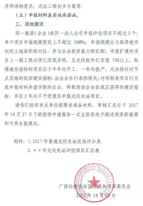 近期,廣西自治區(qū)發(fā)改委開展了2017年全區(qū)光伏電站項(xiàng)目評(píng)優(yōu)工作,要求同一集團(tuán)(企業(yè))或同一法人公司申報(bào)項(xiàng)目不超過2個(gè),單個(gè)項(xiàng)目申報(bào)規(guī)模原則上不能超過30MW;此外如果有倒賣項(xiàng)目行為或者申報(bào)材料弄虛作假的企業(yè)