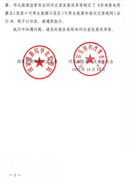關(guān)于印發(fā)《京津唐電網(wǎng)冀北(張家口可再生能源示范區(qū))可再生能源市場化交易規(guī)則(試行)》的通知(華北監(jiān)能市場【2017】517號)
