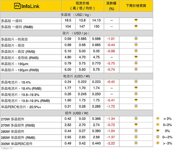 隨硅片、電池片的跌價(jià),本周各區(qū)域組件持續(xù)緩跌。目前看來十一月需求尚可,但對于十二月下旬的需求已逐漸出現(xiàn)疑慮。且由于國內(nèi)分布式的搶裝潮并未出現(xiàn),十二月需求的轉(zhuǎn)弱已是在所難免,預(yù)期接近年底之時(shí),整體供應(yīng)鏈都將再出現(xiàn)一波跌價(jià)。