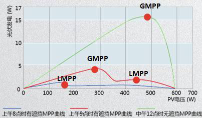 當(dāng)逆變器遇到這種情況(陰影遮擋)時,如果逆變器沒有合適的“陰影掃描算法”,使用常規(guī)的算法會難以找到最大功率點。同時,由于具有多個波峰,波峰高度不同,逆變器可能追到到最低的那個點,系統(tǒng)損失相對更大。另外,盡管一些逆變器能夠在電壓范圍內(nèi)全局掃描追蹤最大功率點,保證光伏系統(tǒng)的輸出。實際上最好的方案還是沒有陰影遮擋。