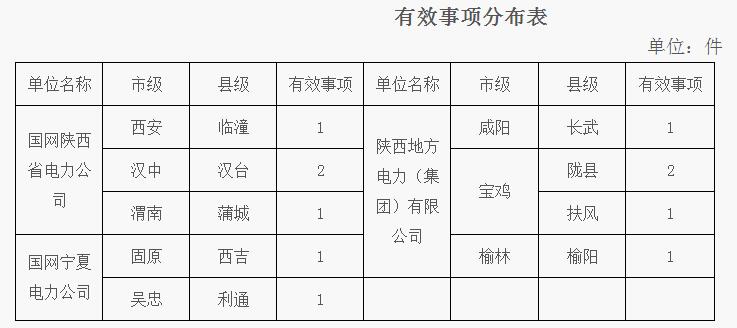 11件有效事項(xiàng)中,涉及電能質(zhì)量3件、停電搶修3件、安全隱患3件、其他2件。其中:陜西省地方電力(集團(tuán))有限公司5件(寶雞3件、咸陽1件、榆林1件),國(guó)網(wǎng)陜西省電力公司4件(漢中2件、西安1件、渭南1件),國(guó)網(wǎng)寧夏電力公司2件(固原1件、吳忠1件)。目前,已辦結(jié)3件,8件正在辦理中。