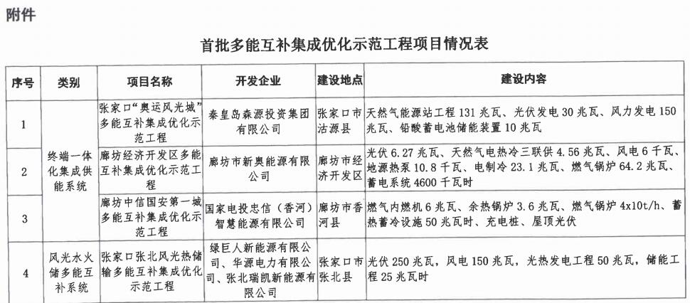 張家口、廊坊市發(fā)展改革委,國網(wǎng)冀北電力有限公司:按照國家能源局《關(guān)于首批多能互補(bǔ)集成優(yōu)化示范工程新能源建設(shè)規(guī)模管理有關(guān)事項(xiàng)的通知》(國能發(fā)規(guī)劃〔2017〕60號)要求,現(xiàn)就下達(dá)示范工程建設(shè)規(guī)模有關(guān)事項(xiàng)通