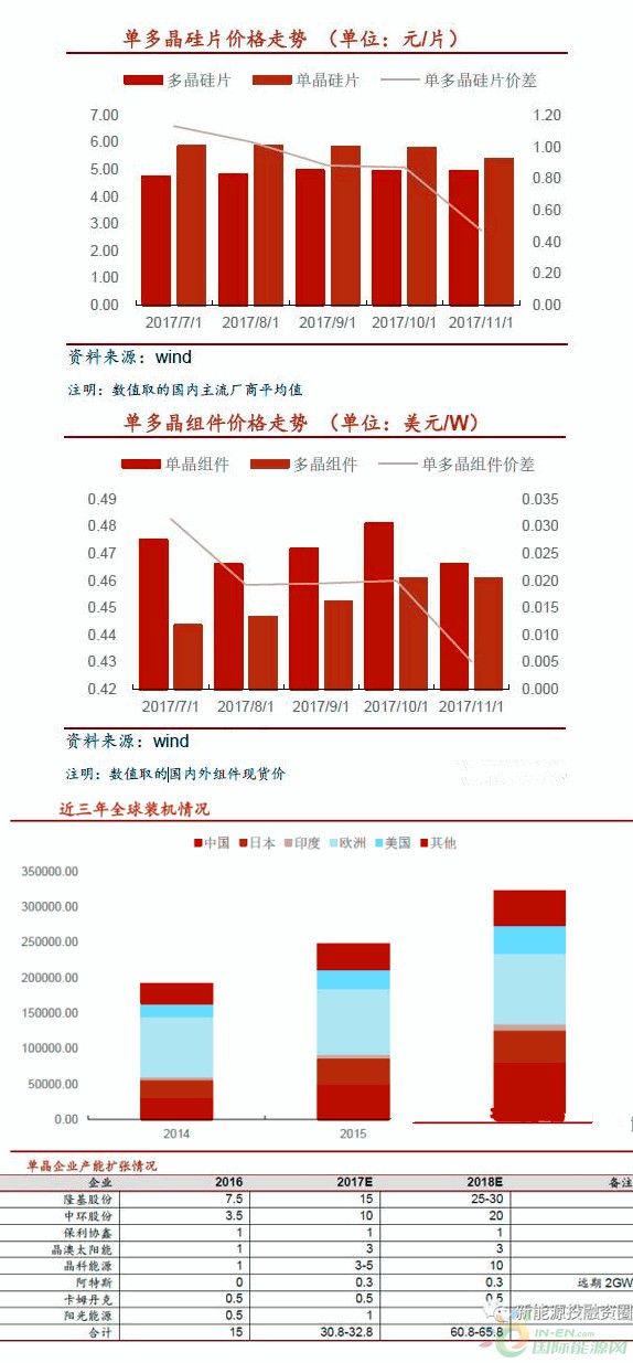 歐美四季度是淡季,是觸發(fā)單晶硅片價(jià)格下調(diào)主要原因:此次調(diào)價(jià)的最主要原因是歐美由于圣誕節(jié),裝機(jī)需求開始下降,而從2017 年Q4 到2018 年Q1,全球市場(chǎng)需求來自新興市場(chǎng),如印度、拉美等國(guó)家,這些國(guó)家對(duì)組件價(jià)格的敏感度高,更偏好目前價(jià)格依舊相對(duì)較低的多晶組件。