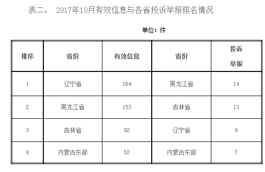 2017年10月,從12398能源監(jiān)管熱線收到的有效信息數(shù)量來看,遼寧省居首位;從投訴舉報數(shù)量來看,黑龍江省居首位。(詳細(xì)情況見表二)