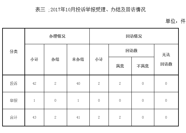 根據(jù)國家有關(guān)法律法規(guī)規(guī)定,對2017年10月收到的43件投訴舉報進(jìn)行了受理,占投訴舉報量的100%。(詳細(xì)情況見表三)