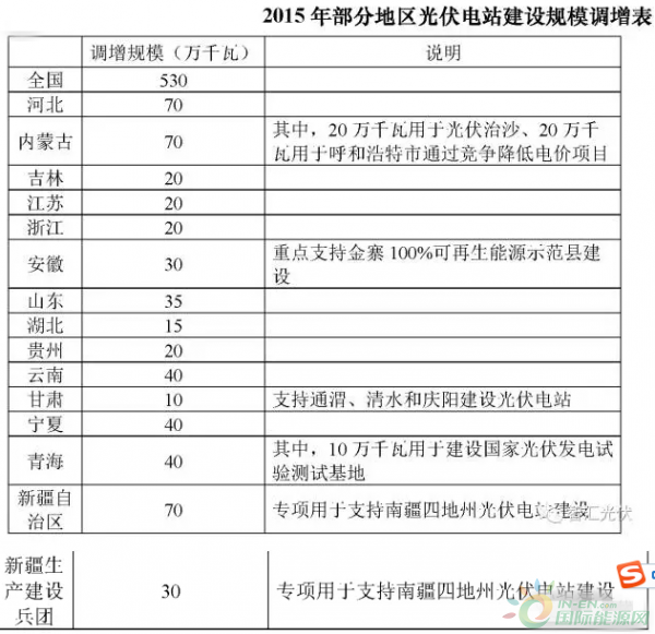 2015年9月24日,國(guó)家能源局根據(jù)上半年的裝機(jī)量情況,下發(fā)了《關(guān)于調(diào)增部分地區(qū)2015年光伏電站建設(shè)規(guī)模的通知》(國(guó)能新能〔2015〕356號(hào)),將當(dāng)年的指標(biāo)調(diào)增了5.3GW。