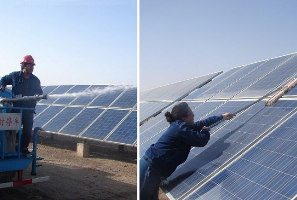 人工干洗組件:人工干洗是采用長(zhǎng)柄絨拖布配合專(zhuān)用洗塵劑進(jìn)行清洗,使用的油性靜電吸塵劑。主要利用靜電吸附原理,具有吸附灰塵和沙粒的作用,能夠增強(qiáng)清洗工具吸塵去污能力,有效地避免在清掃時(shí)的灰塵沙粒飛揚(yáng)。由于完全依靠人力,存在表面殘留物較多、組件由受力不均可能產(chǎn)生變形隱裂的問(wèn)題。壓縮空氣吹掃是通過(guò)專(zhuān)用裝置吹出壓縮空氣清除組件表面的灰塵,用于水資源匱乏的地區(qū)。這種方式效率低,且存在灰塵高速摩擦組件的問(wèn)題,目前很少有電站使用。