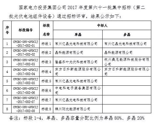 國家電投2017度第六十一批集中招標(biāo)3.4GW組件、3.75GW逆變器中標(biāo)結(jié)果公示