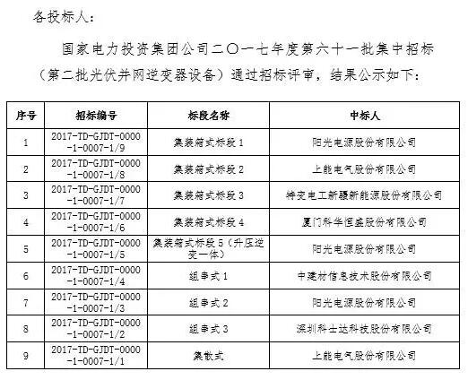 12月8日,國家電投公示2017度第六十一批集中招標(biāo)第二批光伏組件、并網(wǎng)逆變器中標(biāo)結(jié)果。