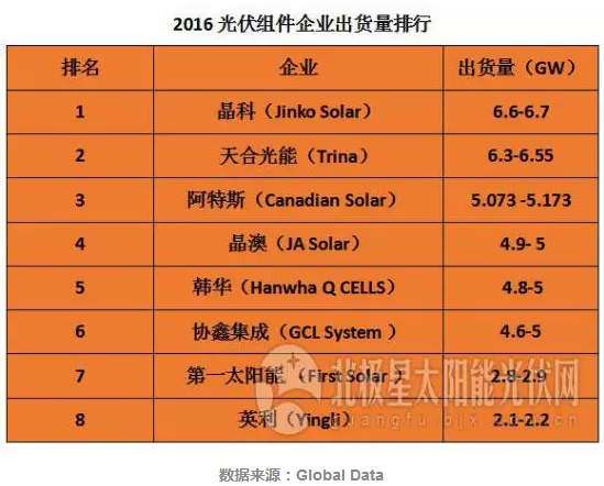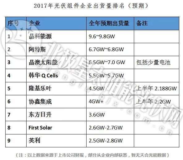 預(yù)測(cè) | 2017年TOP級(jí)光伏組件企業(yè)出貨量排名