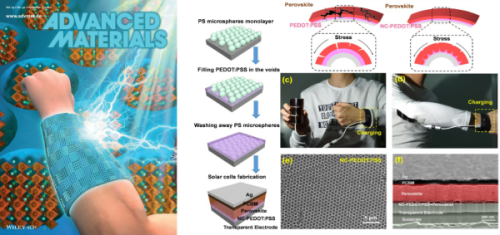 近年來,金屬有機雜化鈣鈦礦太陽能電池以其優(yōu)越的光電轉(zhuǎn)換性能而受到廣泛關(guān)注。基于鈣鈦礦材料平面結(jié)構(gòu)器件的光電轉(zhuǎn)換效率在短短幾年時間取得重要突破,最高效率為22.1%。卓越的光電性能為其應(yīng)用在可穿戴電子設(shè)備提供了可能。但柔性鈣鈦礦太陽能電池尚未能切實應(yīng)用于可穿戴電子設(shè)備中,限制這一發(fā)展是因為當(dāng)前柔性器件仍存在大面積重現(xiàn)性差和彎折性能衰減的問題。