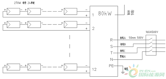 方案1,系統(tǒng)采用72片340Wp光伏組,20串12并共240塊組成,總功率 81.6KWp。采用1臺80KW光伏逆變器,接入380V線,送入光伏并網(wǎng)接入配電箱,再接入10kV柱上變壓器380V母線端。