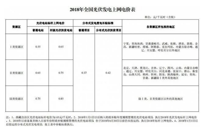 國家發(fā)展改革委于2017年12月22號下發(fā)《關(guān)于2018年光伏發(fā)電項目價格政策的通知》,要求降低2018年1月1日之后投運的光伏電站標(biāo)桿上網(wǎng)電價,Ⅰ類、Ⅱ類、Ⅲ類資源區(qū)標(biāo)桿上網(wǎng)電價分別調(diào)整為每千瓦時0.55元、0.65元、0.75元(含稅);村級光伏扶貧電站上網(wǎng)電價分別為0.65元、0.75元、0.85元;通知規(guī)定,2018年1月1日以后投運的、采用“自發(fā)自用、余量上網(wǎng)”模式的分布式光伏發(fā)電項目,全電量度電補貼標(biāo)準(zhǔn)降低0.05元,即補貼標(biāo)準(zhǔn)調(diào)整為每千瓦時0.37元(含稅)。采用“全額上網(wǎng)”模式的分布式光伏發(fā)電項目按所在資源區(qū)光伏電站價格執(zhí)行。