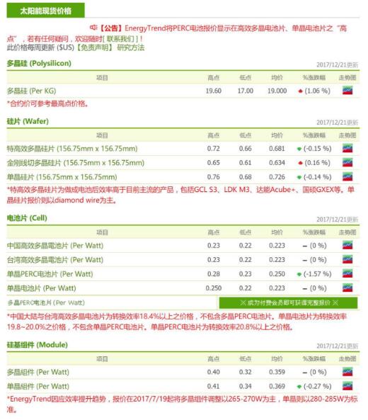 本周組件價格穩(wěn)定,因為大廠有各種轉移訂單的方式,讓將生產(chǎn)排程排至一月,使得訂單能夠穩(wěn)定下來。然而隨著中國大陸分布式行情接近尾聲,中小型組件廠反饋一月訂單能見度不足,對市況較為擔憂。中國已正式調(diào)降分布式系統(tǒng)的FIT,且要求從2018/1/1開始執(zhí)行,但預期此類需求仍會持續(xù),另會有來自今年遞延的領跑者項目的需求。