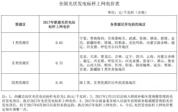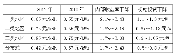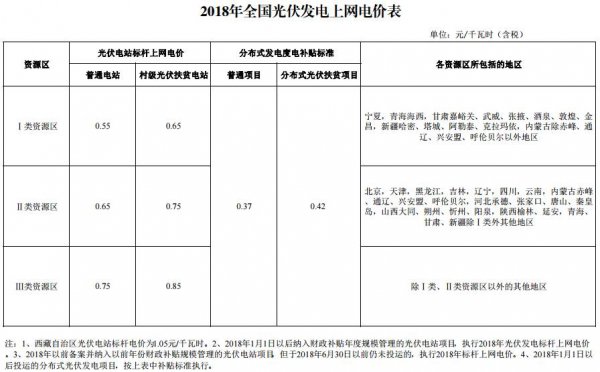 國家發(fā)展改革委于2017年12月22號下發(fā)《關(guān)于2018年光伏發(fā)電項(xiàng)目價格政策的通知》,要求降低2018年1月1日之后投運(yùn)的光伏電站標(biāo)桿上網(wǎng)電價,Ⅰ類、Ⅱ類、Ⅲ類資源區(qū)標(biāo)桿上網(wǎng)電價分別調(diào)整為每千瓦時0.55元、0.65元、0.75元(含稅);村級光伏扶貧電站上網(wǎng)電價分別為0.65元、0.75元、0.85元;通知規(guī)定,2018年1月1日以后投運(yùn)的、采用“自發(fā)自用、余量上網(wǎng)”模式的分布式光伏發(fā)電項(xiàng)目,全電量度電補(bǔ)貼標(biāo)準(zhǔn)降低0.05元,即補(bǔ)貼標(biāo)準(zhǔn)調(diào)整為每千瓦時0.37元(含稅)。采用“全額上網(wǎng)”模式的分布式光伏發(fā)電項(xiàng)目按所在資源區(qū)光伏電站價格執(zhí)行。