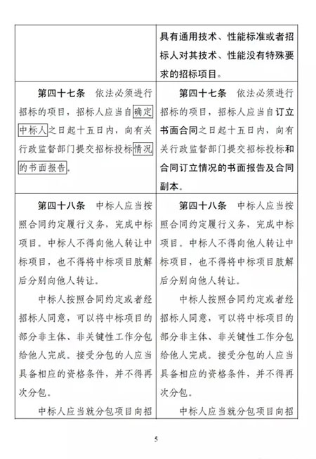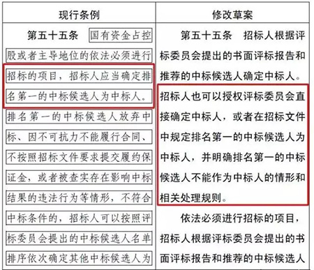 其中,最受大家關(guān)注的一點(diǎn)是:招標(biāo)人可以直接確定中標(biāo)人。該條修改前后對照如下:
