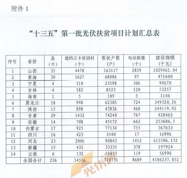 隨著扶貧攻堅(jiān)戰(zhàn)進(jìn)入關(guān)鍵階段,近日國(guó)家能源局、國(guó)務(wù)院扶貧開(kāi)發(fā)領(lǐng)導(dǎo)小組辦公室聯(lián)合發(fā)布《關(guān)于下達(dá)“十三五”第一批光伏扶貧項(xiàng)目計(jì)劃的通知》,經(jīng)過(guò)國(guó)家能源局、國(guó)務(wù)院扶貧辦及相關(guān)單位數(shù)月的辛苦審核,涉及14個(gè)省(自治區(qū))、236個(gè)光伏扶貧重點(diǎn)縣的總規(guī)模4186.237852MW的光伏扶貧項(xiàng)目獲得批準(zhǔn),面向的扶貧對(duì)象為14556個(gè)建檔立卡貧困村的71.0751萬(wàn)戶建檔立卡貧困戶。