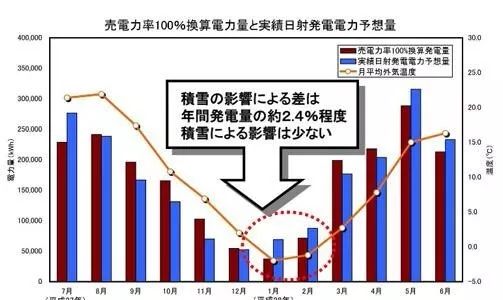 從2015年7月7日到2016年7月6日一年間的實(shí)際年發(fā)電量為165萬(wàn)7000kWh,比計(jì)劃預(yù)計(jì)年發(fā)電量約為140萬(wàn)kWh,值高出了16%。報(bào)告顯示,積雪對(duì)年發(fā)電量的影響只有約2.4%,得出的結(jié)論是,“即使是大雪地帶,只要注意采取對(duì)策也可以導(dǎo)入光伏發(fā)電。