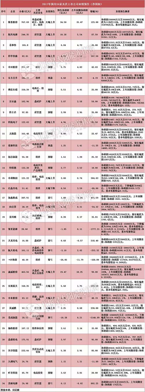 34家光伏企業(yè)2017年業(yè)績預告盤點:4組表看懂企業(yè)競爭力