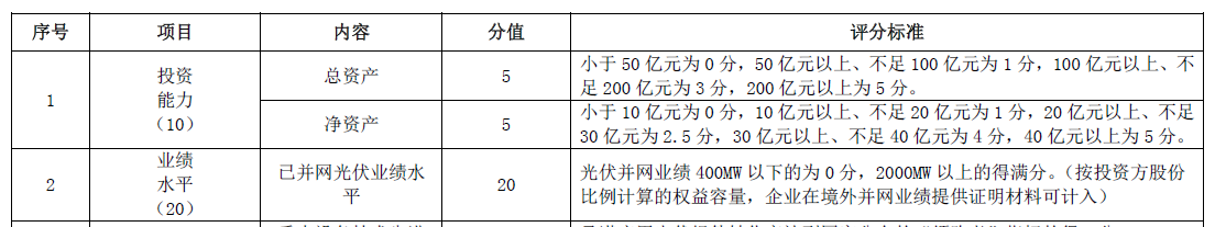 根據(jù)要求,參與投標企業(yè)電站持有容量400MW起步,持有電站2GW以上將獲得滿分20分;在投資能力方面,要想拿到滿分,總資產(chǎn)要在200億元以上,凈資產(chǎn)則要求在40億元以上。