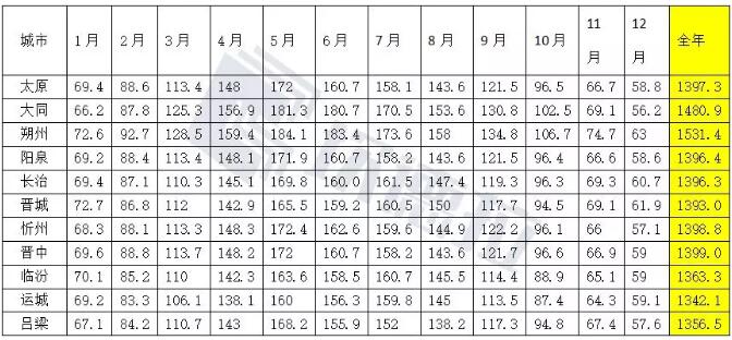 ▼山西地級(jí)市太陽輻射情況匯總表(水平面)