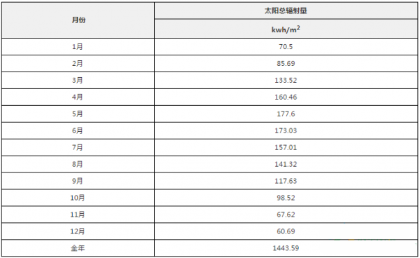 由以上可知,項(xiàng)目所在地的4月、5月、6月、7月平均總輻射量最高,月總輻射量基本都在167.03kwh/m2左右,其中5月輻射量最大,而1月、11月、12月輻照量最小。