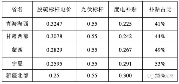 ?、耦愲妰r區(qū)的最新光伏標(biāo)桿電價為0.55元/kWh,在各省的脫硫煤標(biāo)桿電價調(diào)整之后,各省的補(bǔ)貼強(qiáng)度在0.22~0.3元/kWh之間,補(bǔ)貼在電價中的占比為41%~55%;平均補(bǔ)貼強(qiáng)度為0.265元/kWh。具體如下表所示。