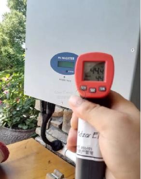 逆變器安裝在北面屋檐下,由于沒(méi)有太陽(yáng)直射,輸出功率為80%,逆變器表面溫度為44.4度,比氣溫高5度左右,整體散熱性能良好。