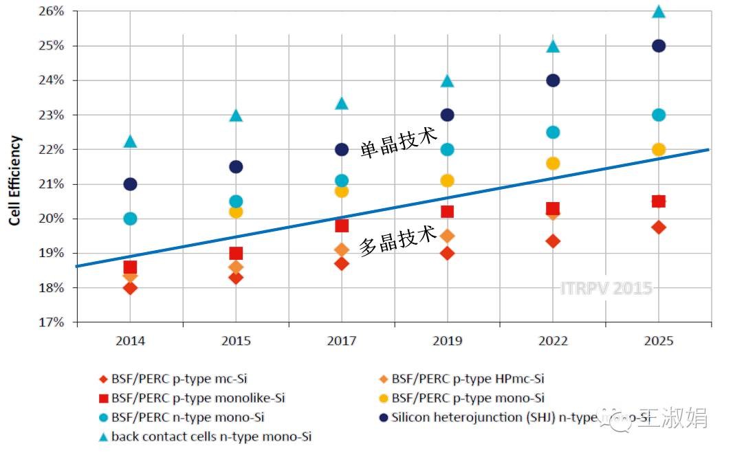 單晶在轉(zhuǎn)換效率方面優(yōu)勢更明顯,尤其PERC技術(shù)的量產(chǎn),對于單晶效率的提升顯著。另外,從產(chǎn)業(yè)技術(shù)趨勢來看,單晶技術(shù)路線相對其他技術(shù)路線擁有更高的轉(zhuǎn)換效率和更大的效率提升空間。圖6為2015國際光伏技術(shù)路線圖。