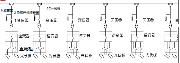 2、交流電經(jīng)100KVA變壓器1,直接升壓至35KV,變壓器、高壓隔離開關(guān)熔斷器、逆變器、避雷器等裝在一套箱變內(nèi)。