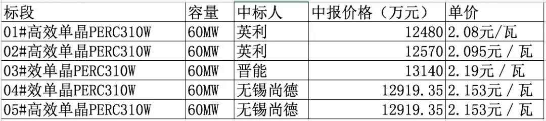 從本次招標結果來看,最低報價為英利能源的2.08元/瓦,最高價格為2.19元/瓦。英利與尚德各中標兩個標段,而晉能則以最高報價分得一個標段。