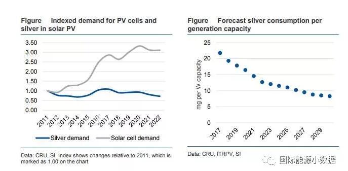 太陽能電池正面和背面生產(chǎn)導電銀漿需要耗銀。根據(jù)國際白銀協(xié)會(The Silver Institute)最新發(fā)布的報告,2009年每片光伏電池含銀量為400毫克,到2016年已經(jīng)降至130毫克,預計到2028年左右光伏電池的含銀量下降一半,達到65毫克;而每片電池的產(chǎn)出從2018年的4.7瓦將增至2030年的6.0瓦,意味著每瓦光伏電池所需要的銀量將下降,從2017年的每瓦22毫克降至2030年的每瓦10.5毫克。