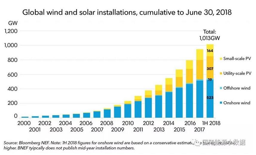 根據彭博新能源財經(BNEF)匯總的數據,至2018年6月底止全球風電、光伏的累計裝機容量達到1,013吉瓦,超過了1,000吉瓦(1 TW)的里程碑。BNEF預計到2023年全球風電、光伏將再凈增1,000吉瓦,屆時總裝機容量將達2,000吉瓦。